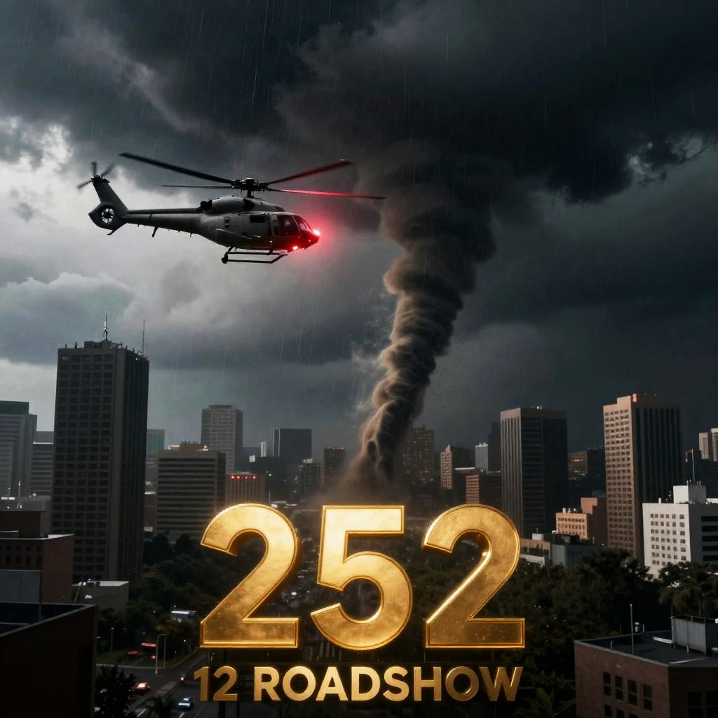 Stormy cityscape with large tornado approaching. Helicopter with red light hovers in upper left. Dark, rainy sky with clouds. Tall buildings and structures in background. "252" in gold at bottom center. Number 12 "ROADSHOW" below.