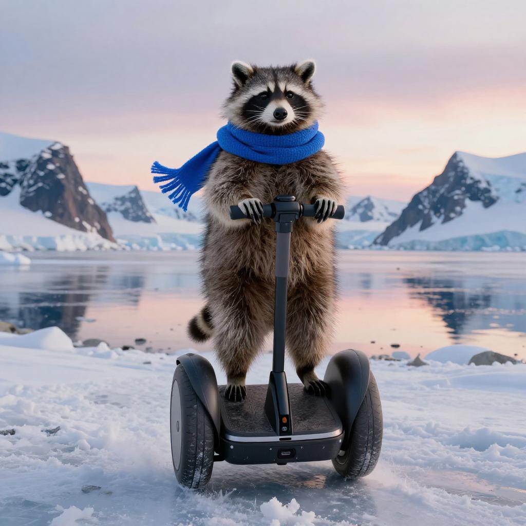 A raccoon wearing a bright blue scarf rides a modern black Segway in a snowy Arctic or Antarctic environment. The background features icy mountains and a calm, reflective frozen lake under a pastel sunset sky. The raccoon is standing upright, gripping the Segway handles, appearing alert and adventurous.