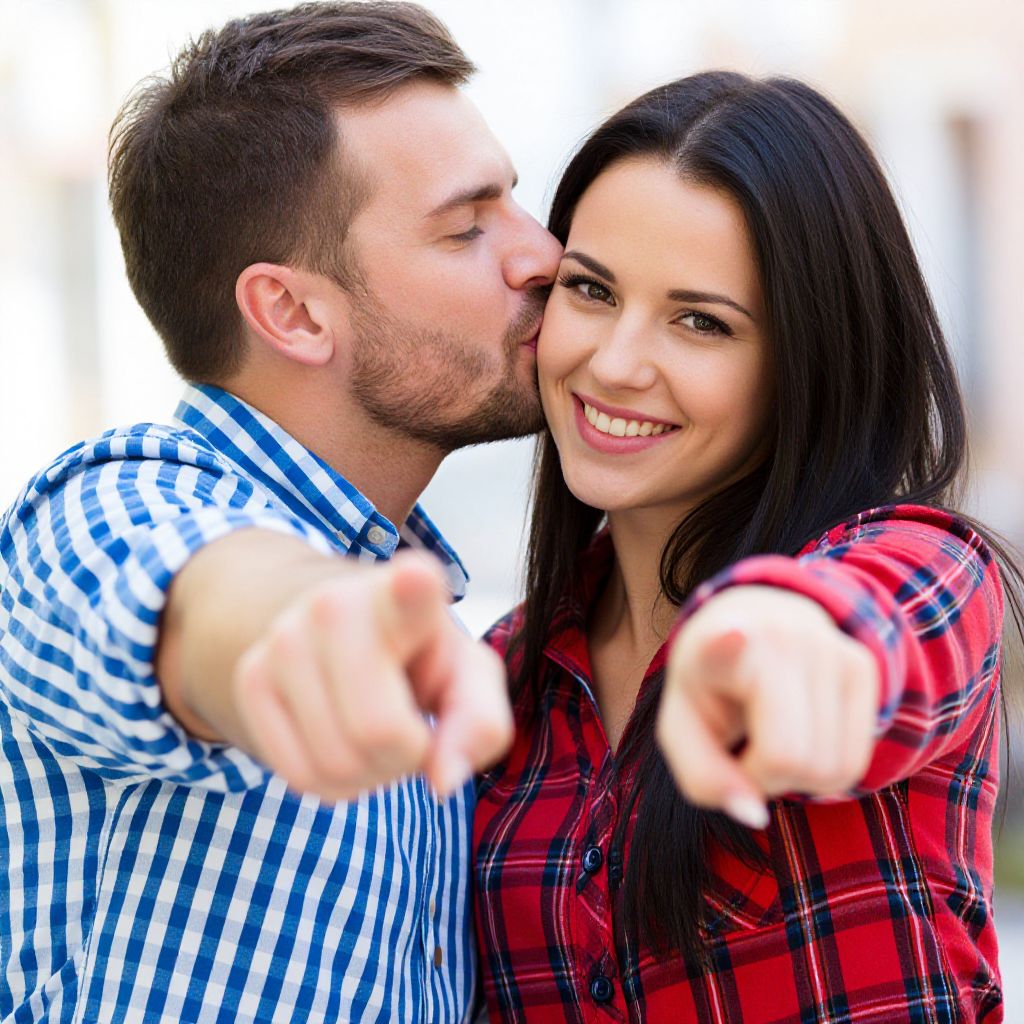 A bright, colorful photograph shows a cute couple in a playful pose. The man, with short brown hair and a trimmed beard, wears a blue and white checkered shirt. The woman, with long dark hair and a red plaid shirt, smiles warmly. They're both pointing towards the camera, with the man kissing her cheek. The background is softly blurred, featuring a bright, sunlit outdoor setting.
