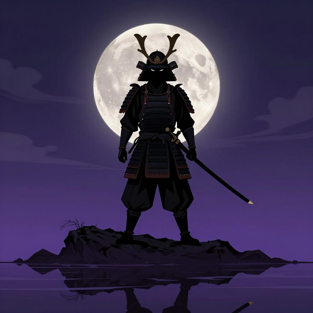 Digital illustration of a muscular ninja character dressed in red and black with a conical hat, standing in profile. The ninja holds a sword in both hands, with two additional sheathed swords on his back. The background features a large full white moon and bold red kanji characters on the left. The ninja wears traditional hakama pants and black armor, striking a dynamic pose with a black and red color scheme.