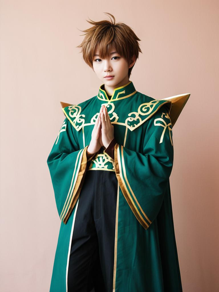 Man cosplay. Wearing Shirou Emiya costume. Realistic photo. Dressed as Shirou Emiya --sref 1400