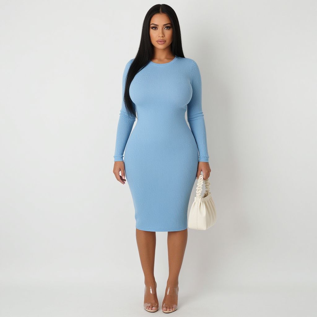 Photograph of a curvy woman with long black hair, wearing a form-fitting, long-sleeved, light blue ribbed dress that reaches just below her knees. She holds a white, pleated clutch in her right hand. She stands against a plain white background, wearing clear, high-heeled shoes. Her expression is neutral, and she has a medium skin tone. The image is well-lit, highlighting the texture of her dress and her smooth skin.