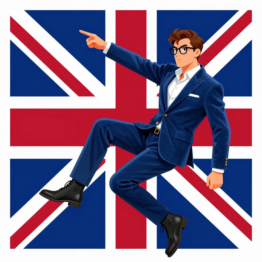 Man in blue velvet suit, white shirt, black boots, and glasses, pointing with right hand, leaning against Union Jack flag. Red and blue background, white lines. Brown hair, intense expression. Mid-air pose, legs bent. Digital illustration.