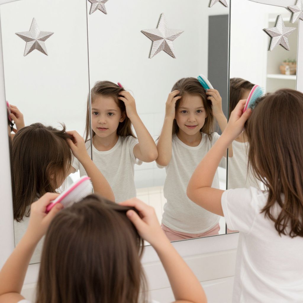Photograph of a young girl with brown hair, wearing a white shirt, brushing her hair in front of a mirror with star decorations.