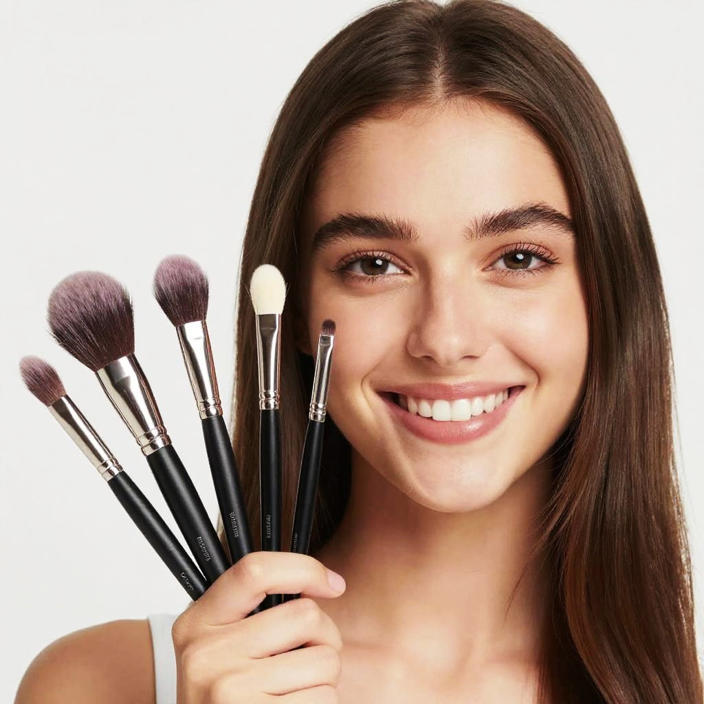 Portrait of a smiling young woman with straight brown hair and light skin holding a fan of makeup brushes. She has dark eyes, subtle natural makeup, and is wearing a black top. The makeup brushes have black handles and white and silver tips. The background is plain white.