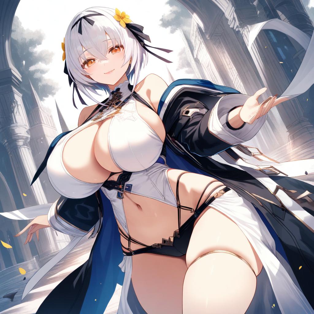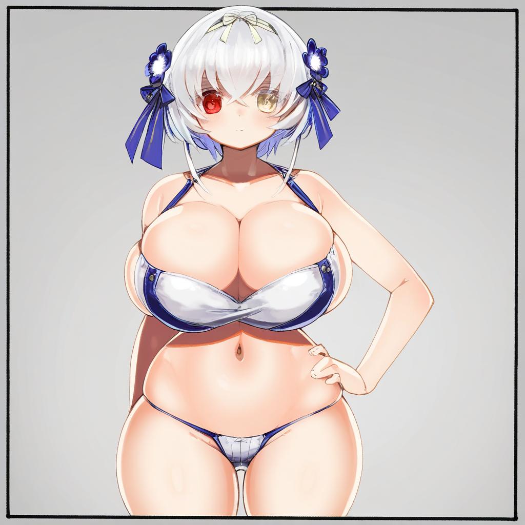 Alicia renato (yashiro sousaku), original, 1girl, heterochromia, red eyes, yellow eyes, hair between eyes, short hair, white hair, crossed bangs, hair flower, hair ribbon, huge breasts, large breasts, cleavage, thighs, navel, skindentation, bare shoulders, by artist maou alba, illustrious