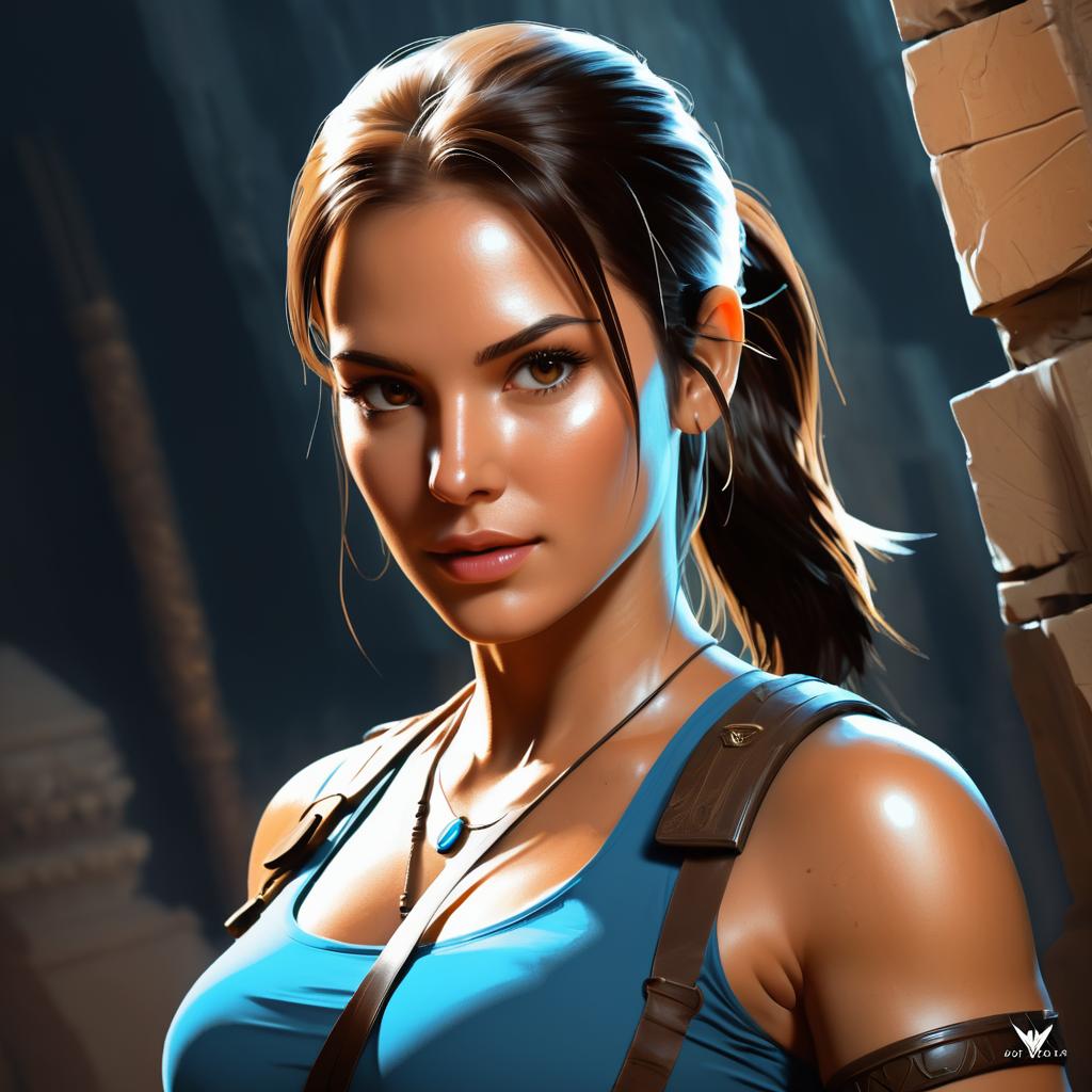 Duotone digital painting of Lara Croft, 3/4 portrait with ancient artifact, style by Dan Luvisi, Sakimichan, trending on ArtStation.