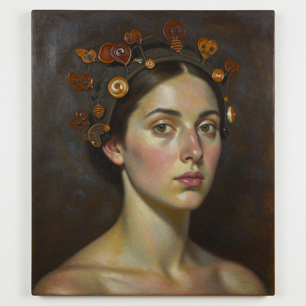 \"\"\"The Players\"\" - Pam Hawkes, oil, bee's wax and Dutch metal on board {contemporary figurative artist beautiful female headdress woman face portrait painting}\