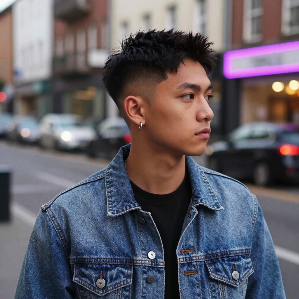 Pompadour Fade hairstyle on man, wearing denim jacket, in urban street, captured in fashion editorial style with neon backlight.