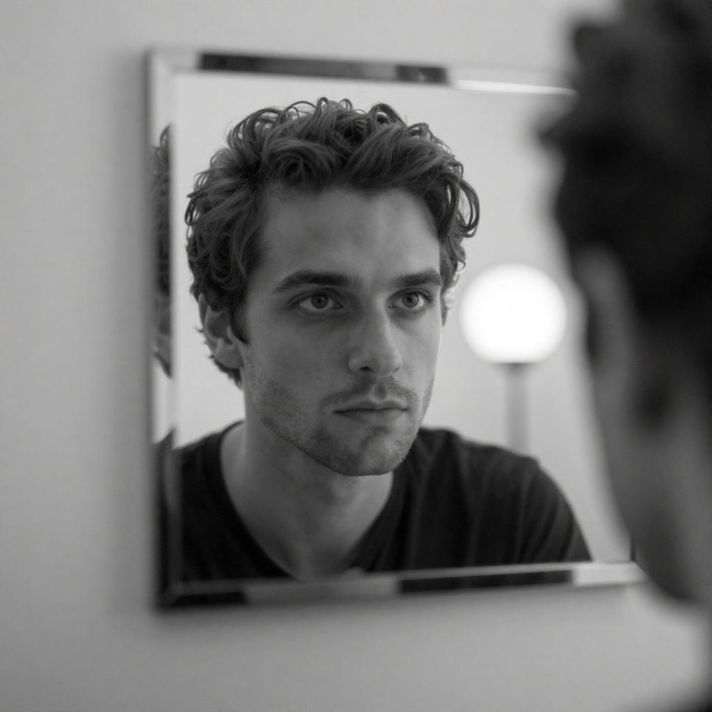 Black and white photograph of a man with wavy hair, intense gaze, reflected in a rectangular mirror. Mirror is slightly blurred, positioned centrally. Soft, out-of-focus light source on the right. Man's face takes up most of the mirror's frame.