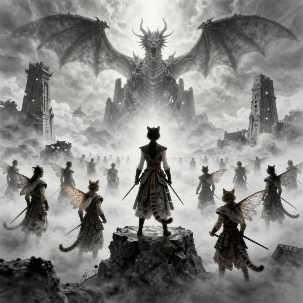 Digital drawing in a dark, fantasy style. Silhouetted against a bright, cloudy sky, a large, menacing dragon with wings spread wide looms in the background. In the foreground, several anthropomorphic cat characters with wings and swords stand on rocky outcrops, facing the dragon. The cats wear medieval-style robes, and their wings are translucent and iridescent. The scene is shrouded in mist, with crumbling, gothic-style towers visible on either side. The overall color palette is monochromatic, with shades of gray and white dominating the image. The composition conveys a sense of impending battle and fantasy epicness.
