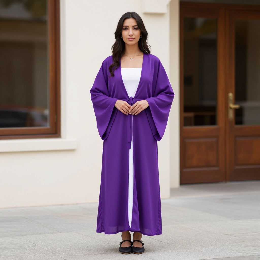 Photograph of a young woman with long, wavy black hair, standing against a white building with wooden doors. She wears a deep purple, loose-fitting robe over a white top and white pants, paired with black Mary Jane shoes. Her hands are clasped in front of her, and she has a neutral expression. The robe's fabric has a soft, smooth texture. The background includes a large window to the left and a wooden door to the right, both with dark brown frames. The ground is a light gray concrete.