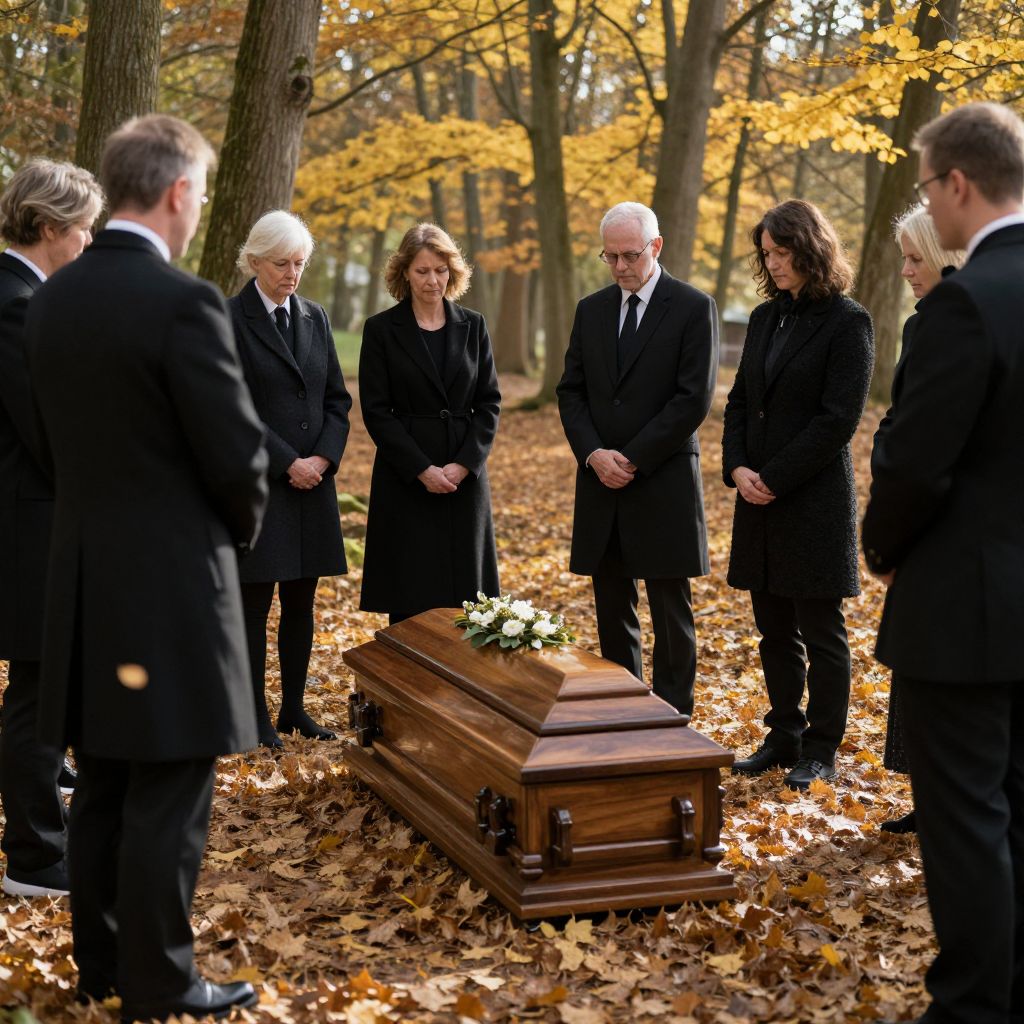 Funerals in a serene autumn forest, golden leaves falling softly around a small wooden coffin, mourners dressed in dark, elegant attire, soft rays of sunlight breaking through the trees, a peaceful and respectful atmosphere, photorealistic style.