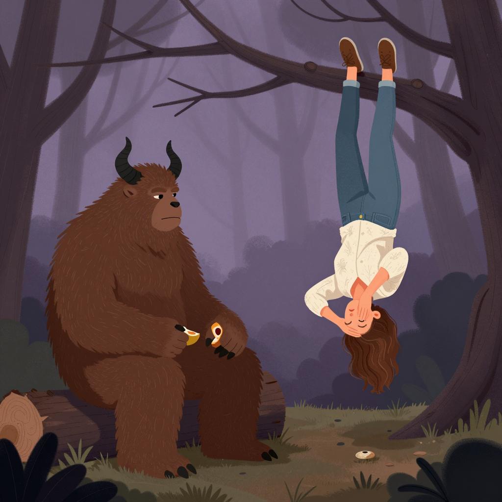 Digital illustration of a forest scene. A large, hairy, brown, anthropomorphic creature with black horns and a snout sits on a log to the left, holding a piece of fruit. A woman with long brown hair, wearing a white patterned shirt, blue jeans, and brown shoes, hangs upside down from a tree branch to the right. The background includes twisted, dark tree roots and a purple, misty sky. The creature looks at the woman, while she has her eyes closed and hands covering her face. Two people.
