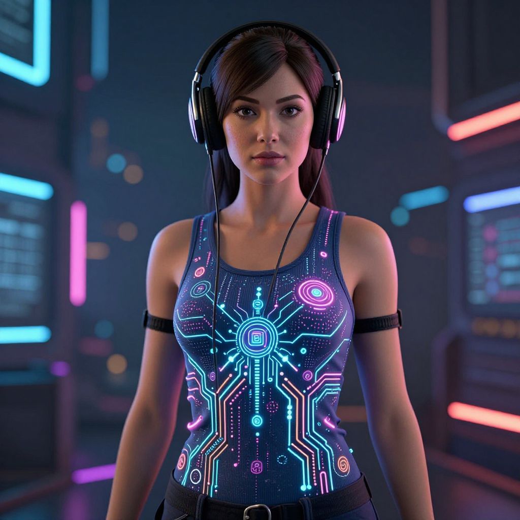 A digital CGI image of an Asian woman with straight black hair, wearing a neon-lit sleeveless top featuring intricate, glowing circuit patterns in blue, pink, and purple. She has black arm bands and large over-ear headphones. The background is a dark, futuristic cityscape with neon lights in blue and pink. Her expression is serious, and she stands centered, facing the camera. The scene has a cyberpunk aesthetic with vibrant, high-contrast lighting.