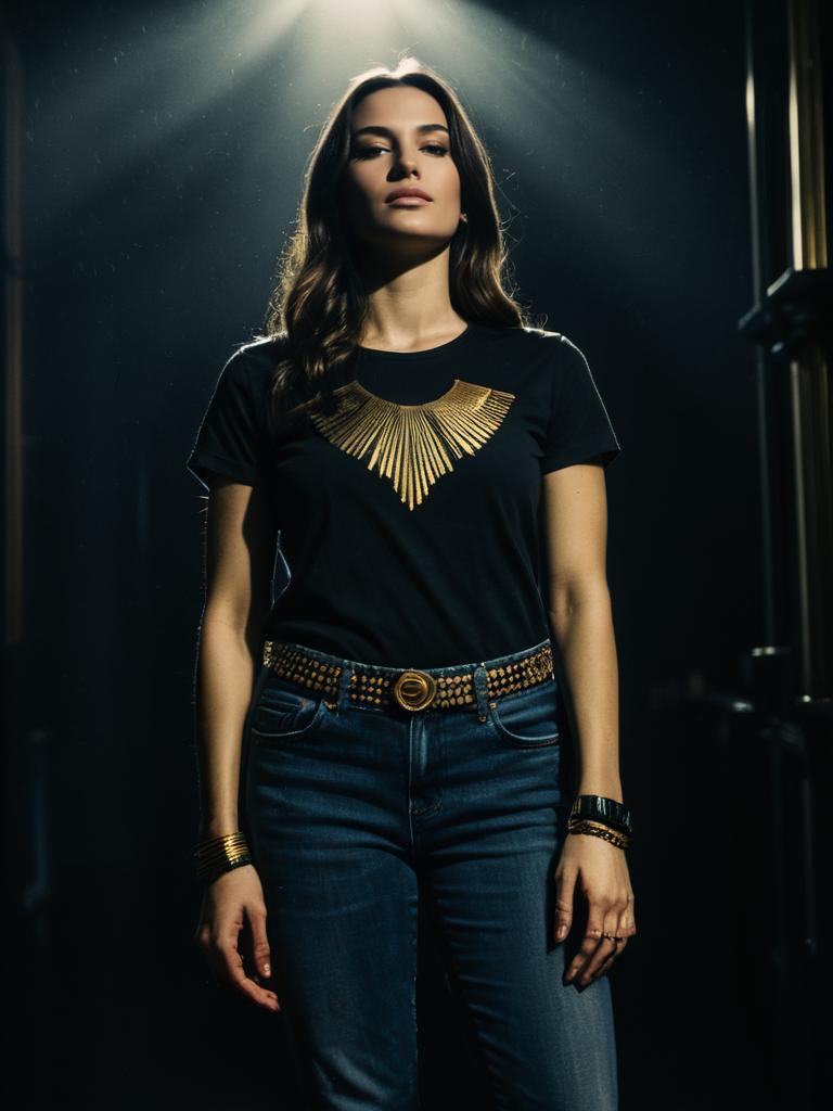 Portrait of a confident young woman wearing a black short-sleeved t-shirt with a gold geometric print on the front, paired with medium wash fitted denim jeans. She accessorizes with a studded belt, metallic cuff bracelet, and a watch, standing against a dark background with dramatic lighting highlighting her features.