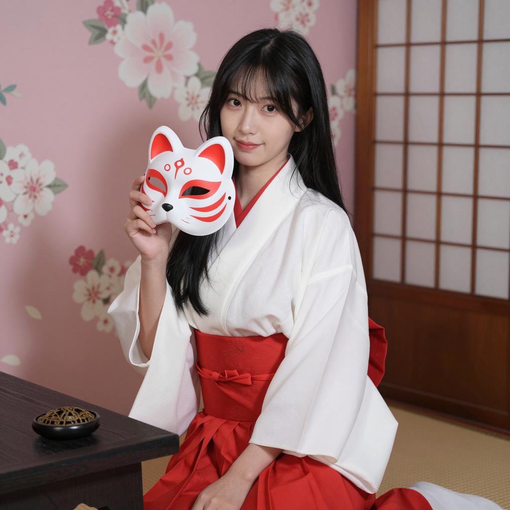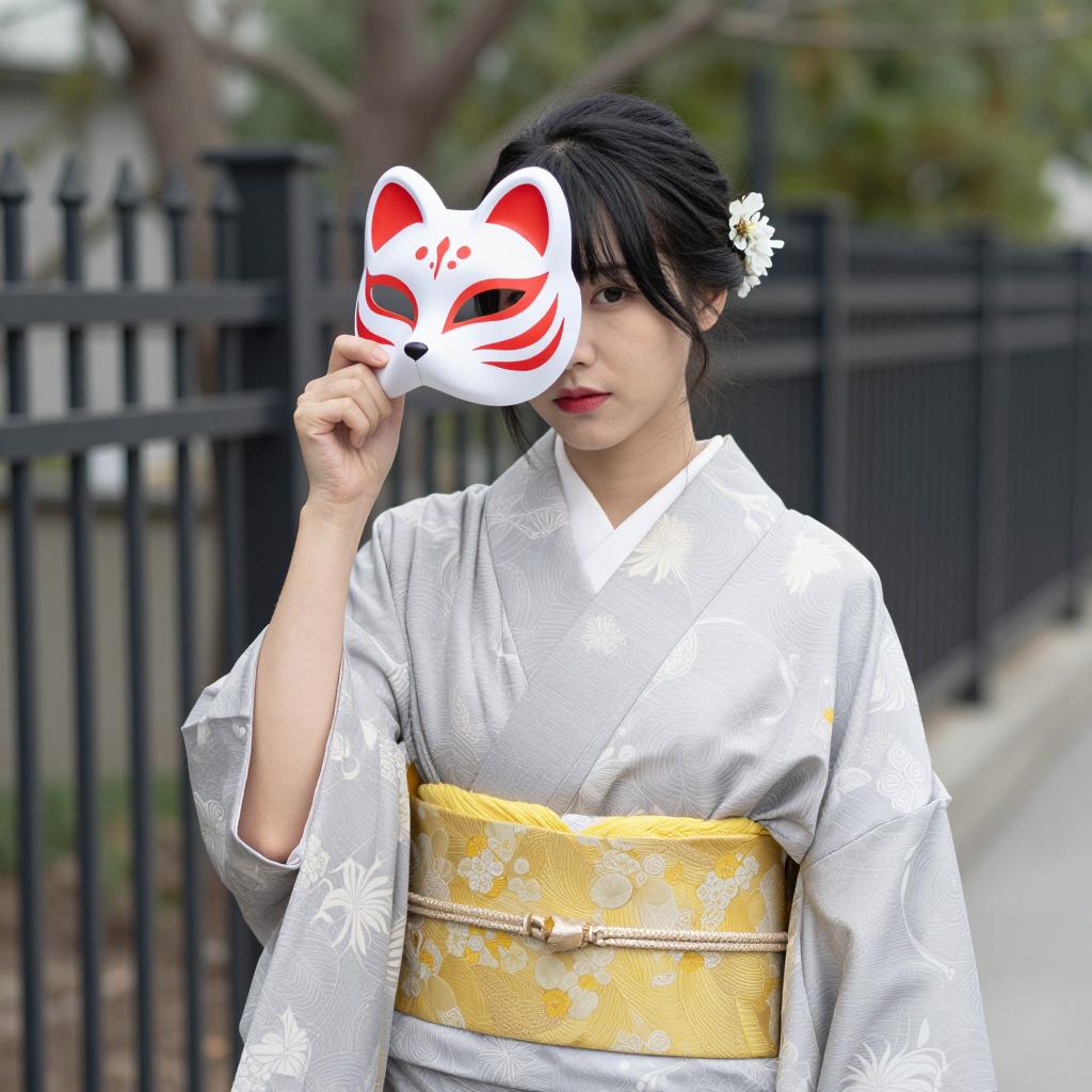 Japanese woman with brown hair in pink hairpins, wearing pink and white striped kimono, holds white fox mask with red and purple details, covering her face. Red wooden shutter background. She gazes sideways. Bright lighting. "CKS * JAPAN" in upper right corner.