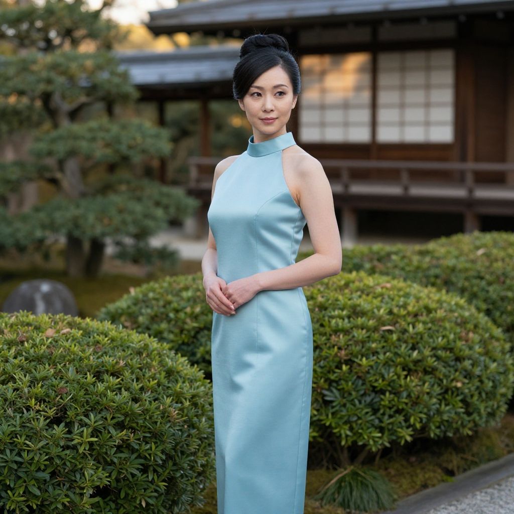 Photograph of an Asian woman in a light blue, sleeveless, high-neck cheongsam, standing in a traditional Japanese garden with greenery and