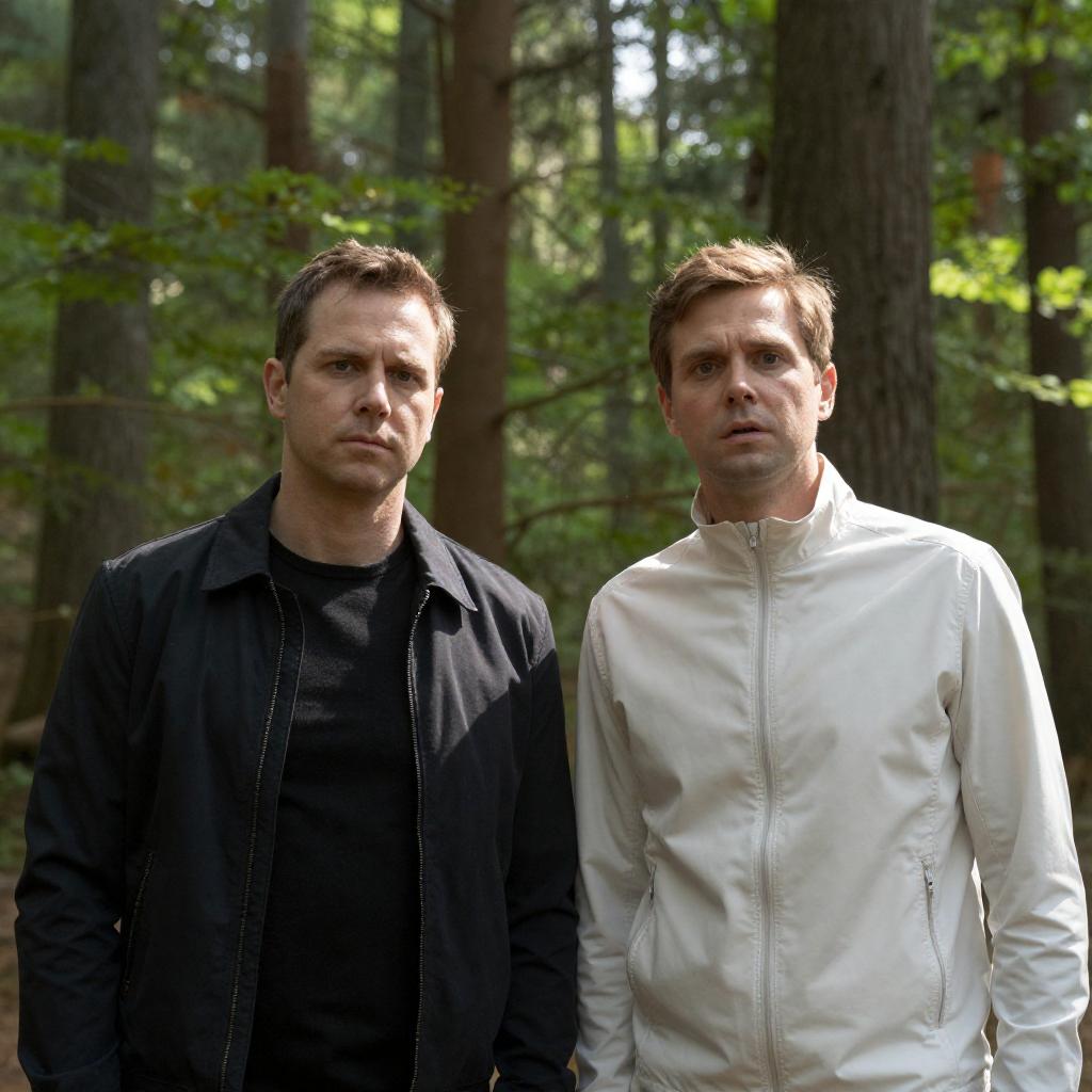 Photograph of two men in a forest. The man on the left has shaggy brown hair, a serious expression, and wears a green jacket with an American flag patch. The man on the right has short gray hair, a concerned look, and wears a black jacket over a dark shirt. Both are leaning forward, with trees and a blurry background behind them.