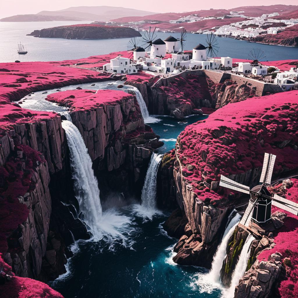 Aerial view of a tranquil fantasy glass pyramid island with glowing runes, inspired by Mykonos windmills, in the style of Moebius, Yoshitaka Amano, Anna Nikonova, trending on ArtStation, featured on Pixiv