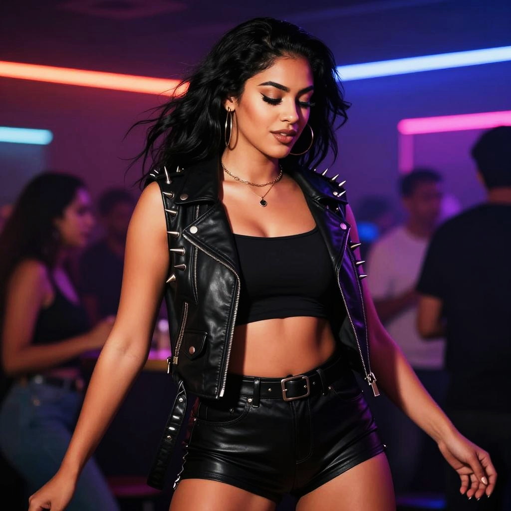 A confident woman with striking black hair dances in a vibrant nightclub atmosphere, illuminated by colorful lights. She wears a stylish leather vest adorned with spikes, paired with a black crop top and shorts that accentuate her bold personality.