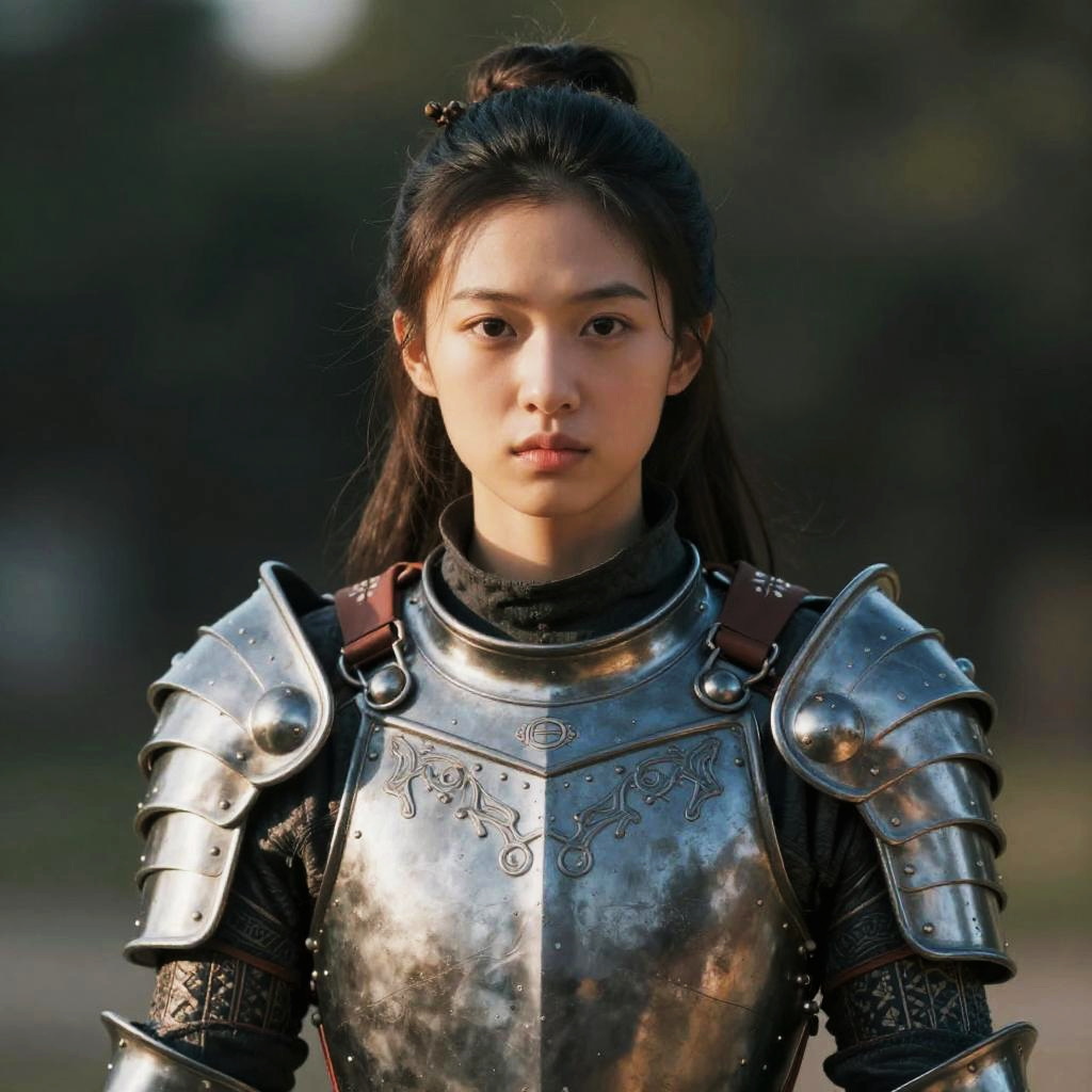 Dark-haired woman in metallic, black armor with gold accents stands confidently in center. Three intimidating, masked warriors with fierce expressions flank her. Dimly lit, ornate background. Two additional figures on left and right. Serious, intense atmosphere.