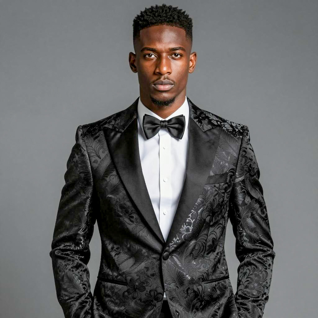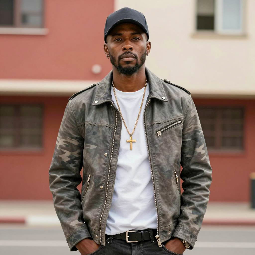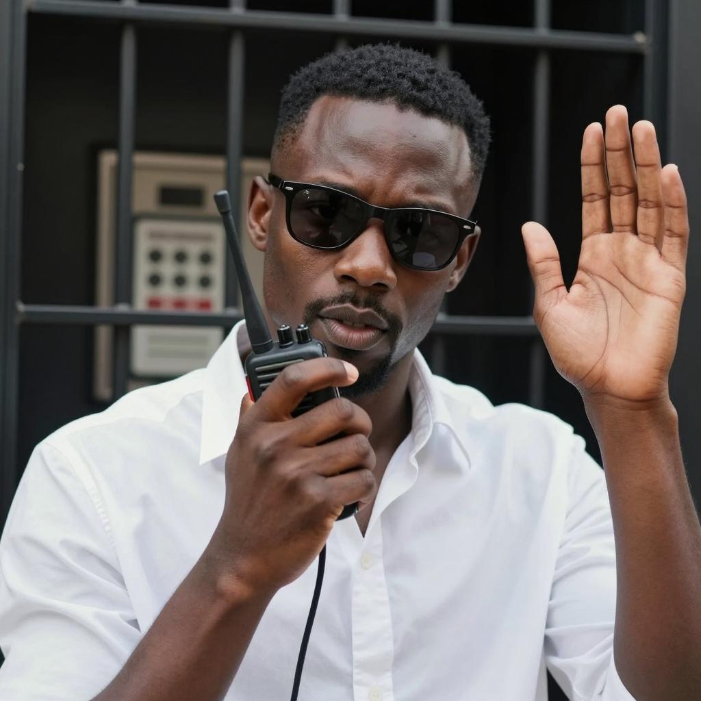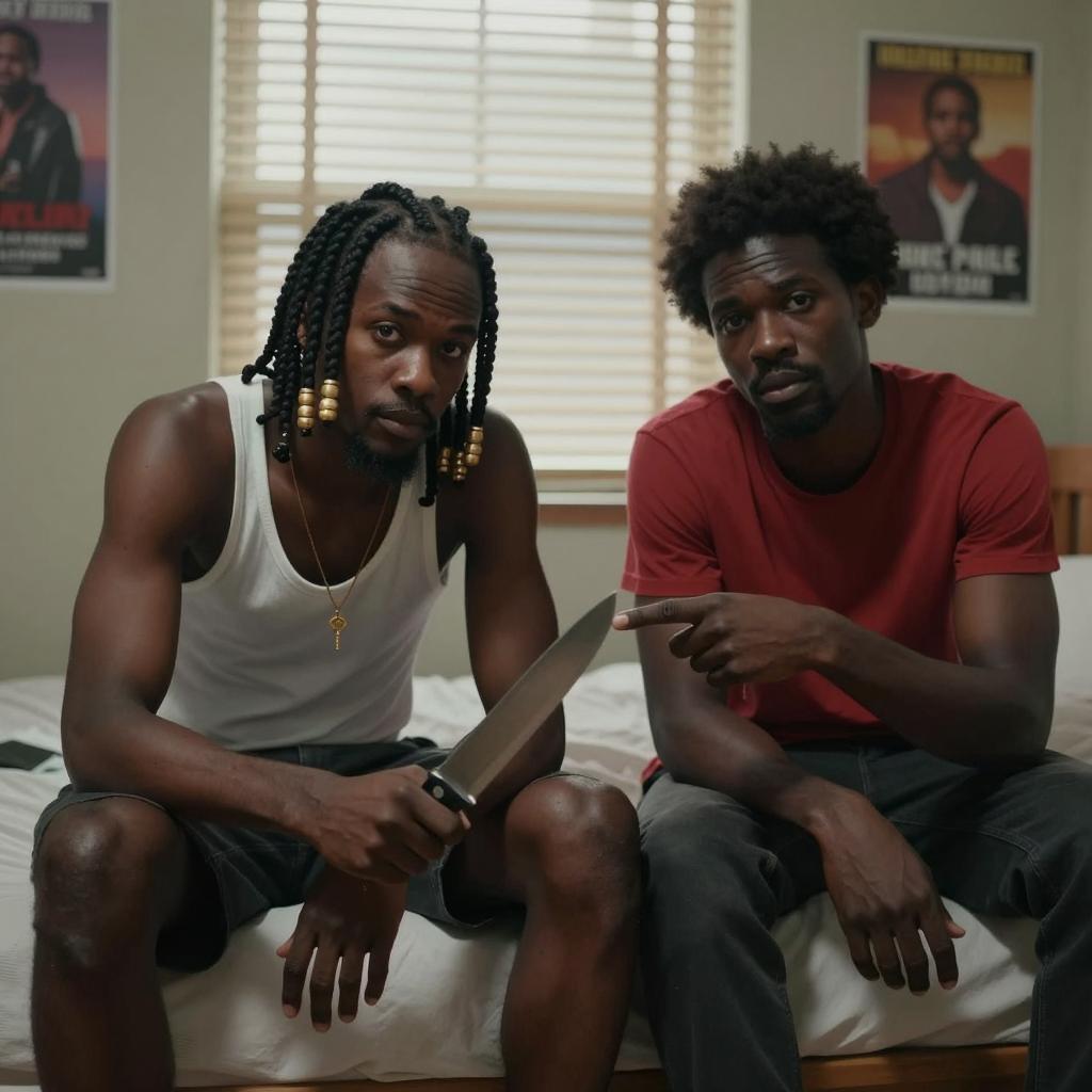 African American man with short blonde hair, intense gaze, wearing white shirt, seated in metallic chair with circular cutouts. Two blue-jacketed figures stand behind him. Metal bars in background.