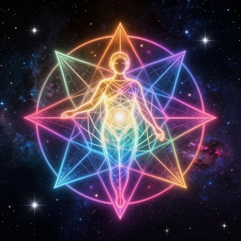 Enneagram symbol intricately designed with glowing geometric patterns, vibrant colors blending seamlessly, mystical aura surrounding the figure, set against a dark cosmic background filled with stars and nebulas, conveying personality and spirituality themes.