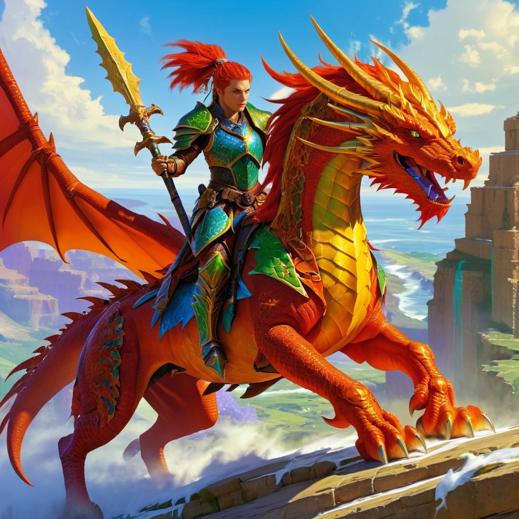 A fierce dragon rider with battle scars and vibrant armor, colorful and cinematic style by Julie Dillon, Michael Whelan, Donato Giancola.