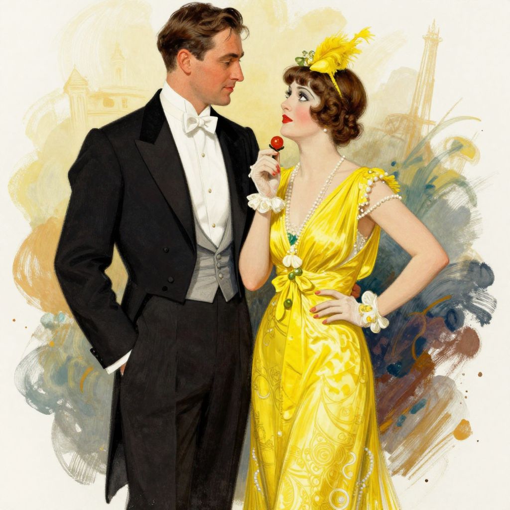 A vibrant 1930s-style illustration featuring a man in a tuxedo and a woman in a yellow dress, captured in a retro, high-definition artistic rendering reminiscent of Georges Leonnec's work, evoking the glamour and elegance of La Vie Parisienne.