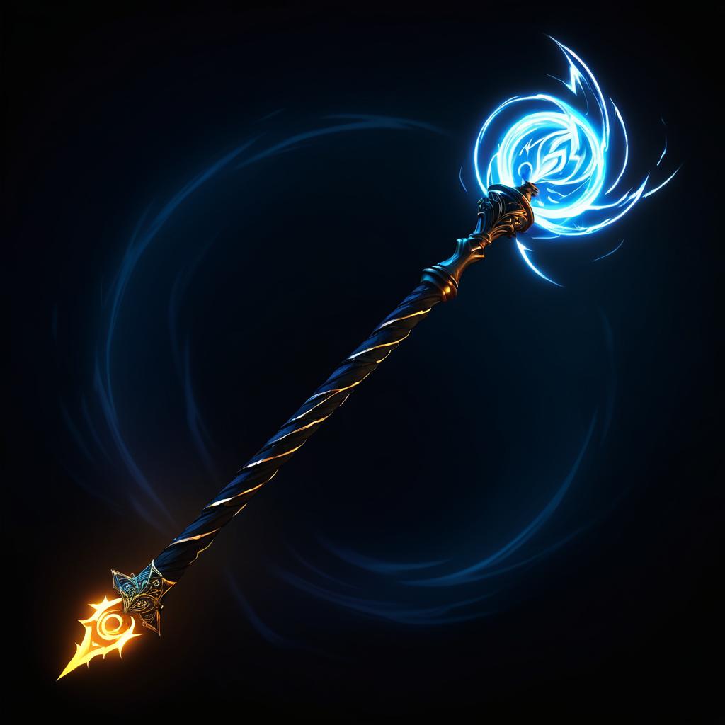 A detailed image of a powerful sorcerer's staff featuring intricate designs and intense glowing effects. The staff emits a bright blue magical aura at the top and a fiery orange glow at the bottom, set against a dark background to enhance the luminous effects. The shaft of the staff is twisted and dark with metallic highlights.