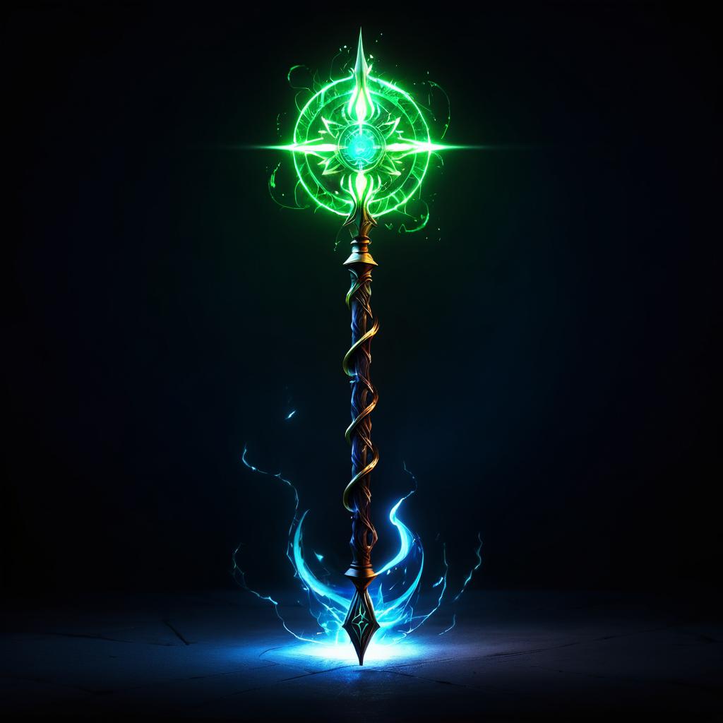 A powerful sorcerer's staff with intense glowing effects and dark background.