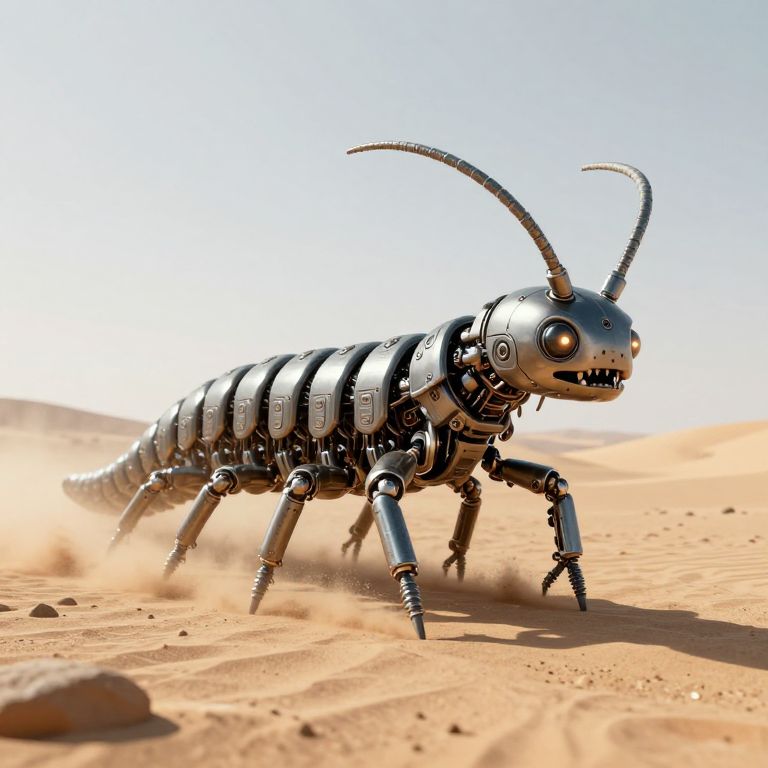 In a surreal, cyberpunk-inspired 3D render, mechanical centipede-like creatures with intricate, segmented bodies and glowing eyes traverse a desolate, sandy landscape, their metallic limbs leaving trails of dust as they move forward with purposeful grace.