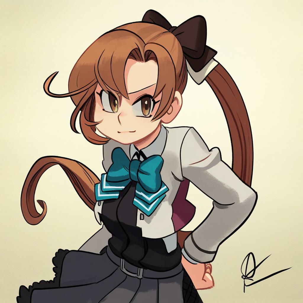 Digital illustration of an anime-style school girl with long brown hair tied in a high ponytail with a black ribbon. She has green eyes with a small mole under one eye and is wearing a modern school uniform featuring a white jacket, black shirt, and a blue bow tie. The character has a confident expression and stylized shading, typical of anime art.
