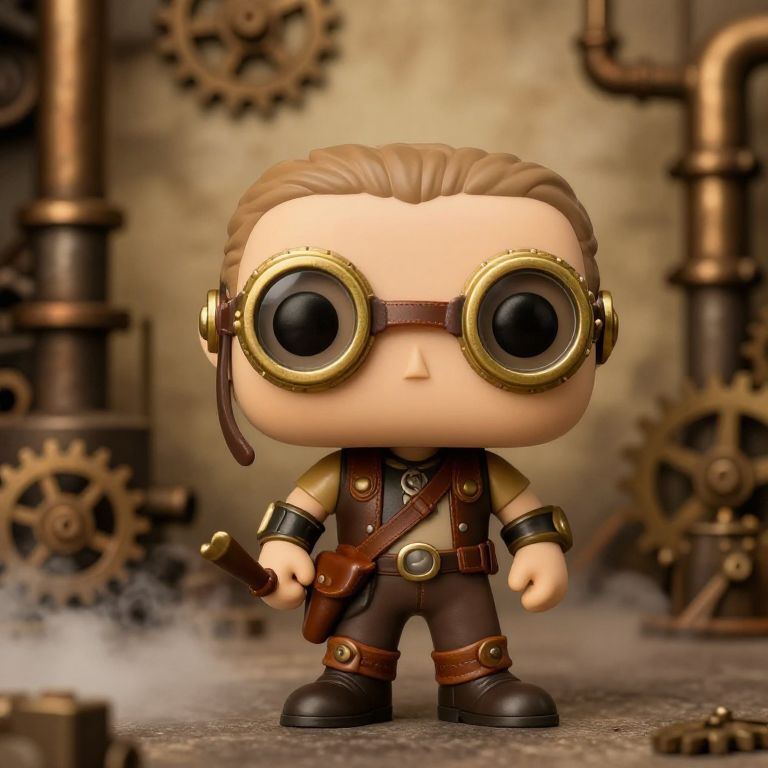 Conceptualize a Funko Pop figure based on a steampunk adventurer, wearing detailed brass goggles, leather straps, and gear accessories, set in a vintage industrial background filled with gears, pipes, and steam clouds, rendered in warm sepia tones.