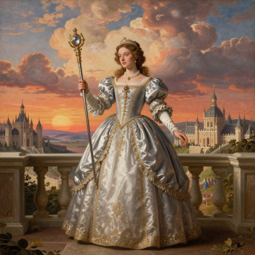 Thick princess holding a jeweled scepter, standing on a balcony overlooking a vast kingdom at sunset, majestic clouds in the sky, detailed renaissance painting style
