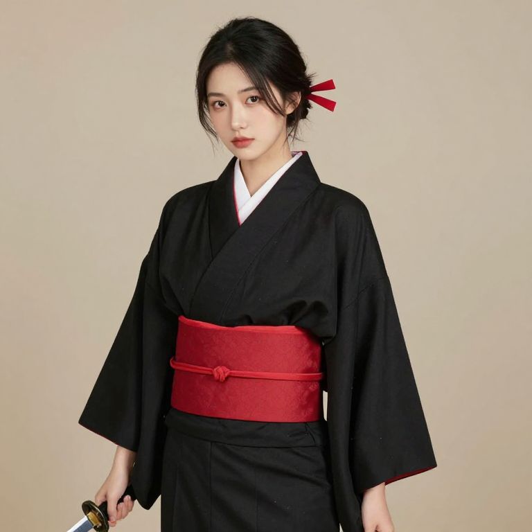 Female wearing a black kimono with a red stripe on the waist and a red ribbon tied around the neck. She is holding a sword in her right hand and has her hair in a bun.