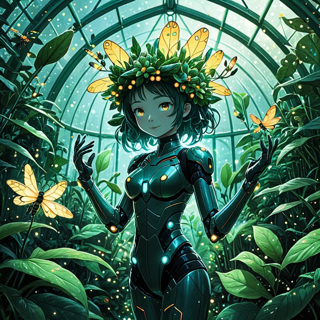 Illustration of a cheerful humanoid plant with leafy features and a glowing flower crown, standing inside a lush, enchanted greenhouse. The figure has a sleek, futuristic, biomechanical body with glowing blue and yellow highlights. Surrounding the character are luminous firefly-like insects and thriving green foliage, creating a magical and vibrant atmosphere.
