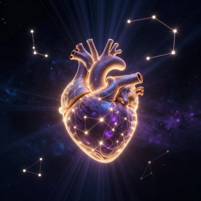 Digital artwork of a glowing, illuminated human heart surrounded by a starry, cosmic background with constellation lines.