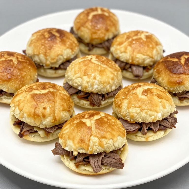Golden-brown sliders filled with rich, tender roast beef are neatly arranged on a white plate, showcasing the savory delight crafted by JavaCupcake.com.