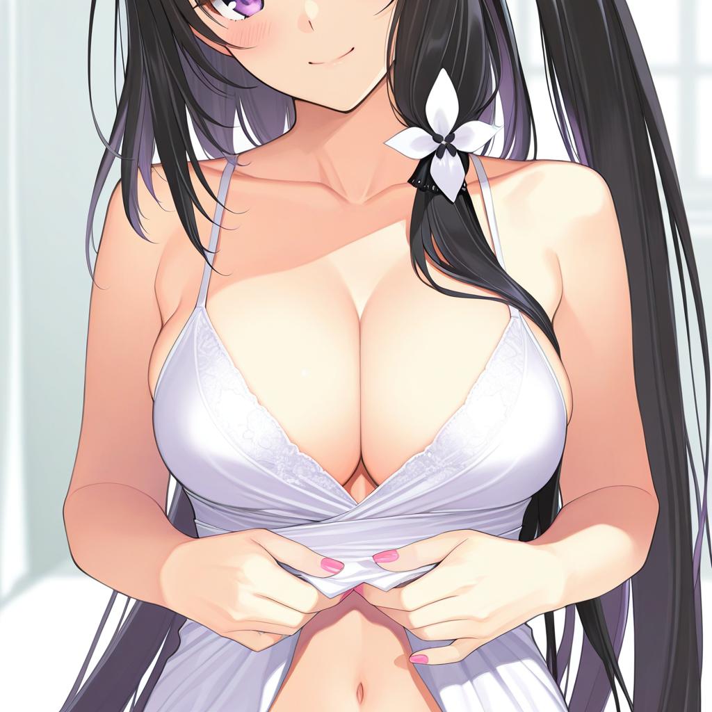 Architect (girls' frontline), girls' frontline, 1girl, pink eyes, purple eyes, black hair, very long hair, side ponytail, hair ornament, medium breasts, large breasts, cleavage, navel, collarbone, bare shoulders, pink nails, nail polish, one side up, by artist mibu natsuki, illustrious