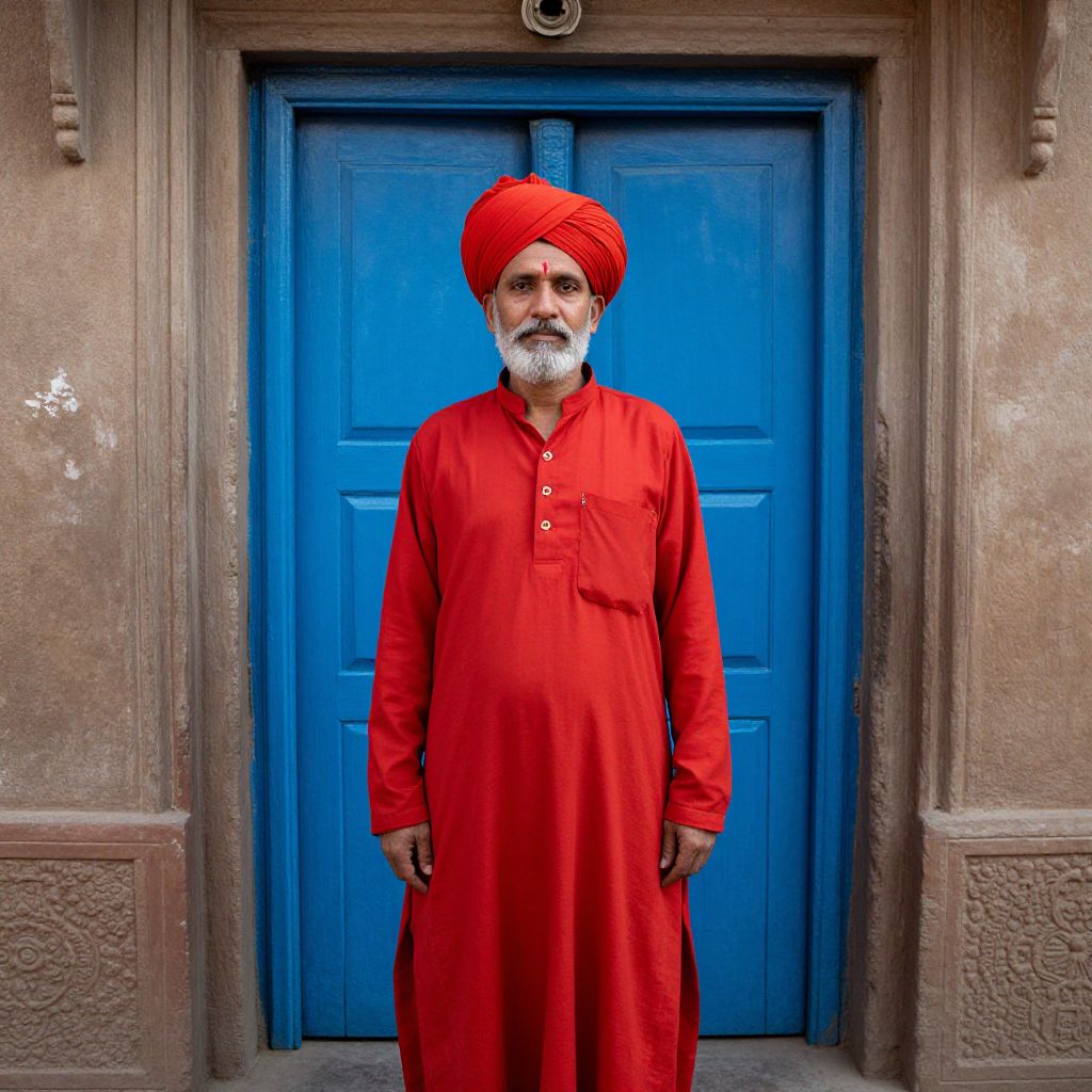 Serenity and devotion intertwine as a Sikh man stands before the Golden Temple, his vibrant orange attire mirroring the sacred pool's reflective surface, evoking a profound sense of spiritual connection and timeless peace.