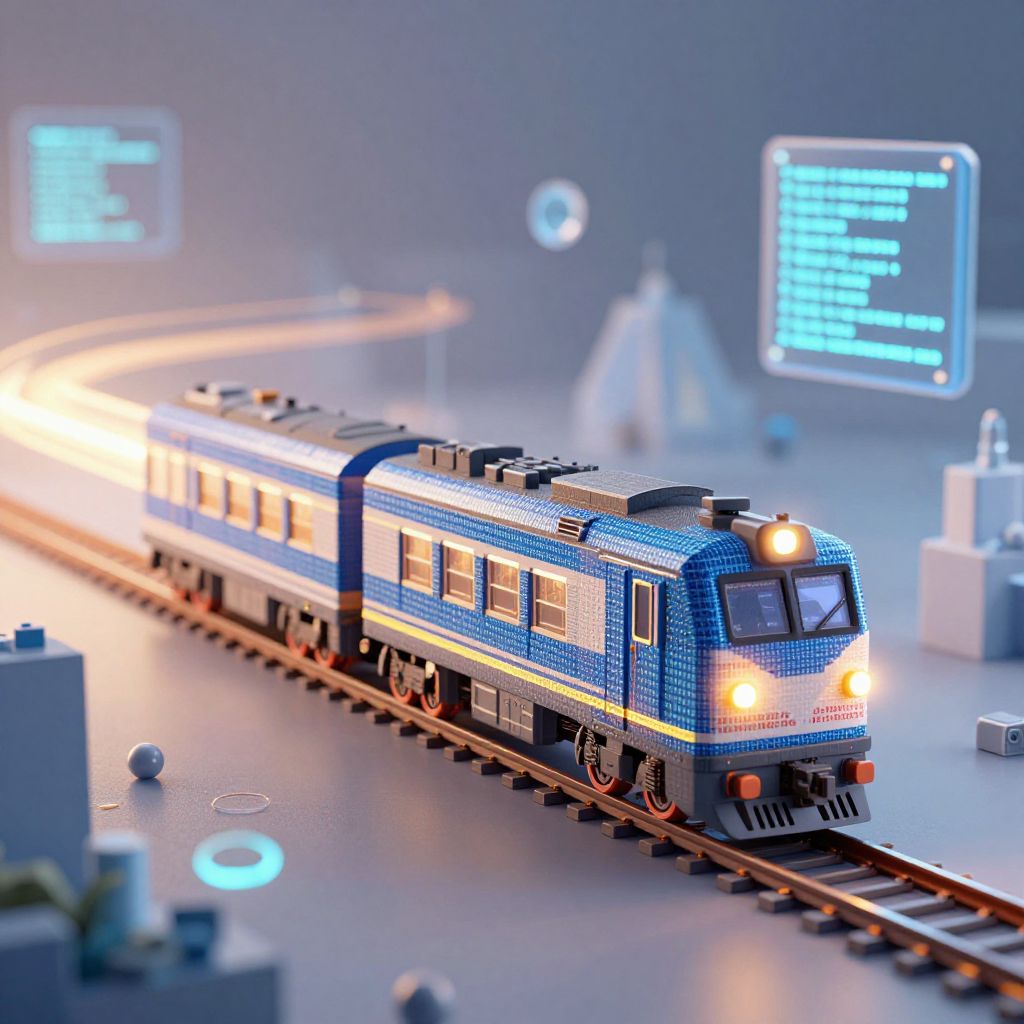 A stable diffusion train model represented by a stylized train composed of pixelated data and light beams, moving through a surreal landscape of floating code and geometric shapes, blending technology and imagination, soft glowing atmosphere, ultra-detailed.