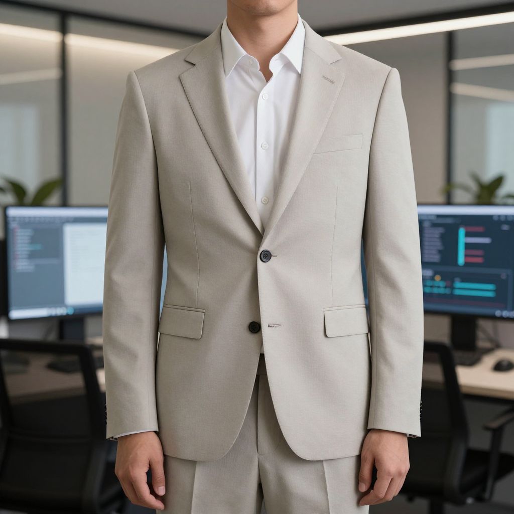 Photograph of a man from the chest down, wearing a light beige suit with a single black button and white dress shirt. The suit is well-fitted, with subtle stitching and two flap pockets. His hands hang naturally by his sides. The background features a modern office with large windows, bright lighting, and two computer monitors displaying code on a screen. The office has a clean, professional atmosphere with potted plants visible in the distance. The image is sharply focused on the suit, with a slight blur in the background.