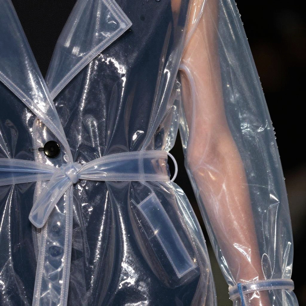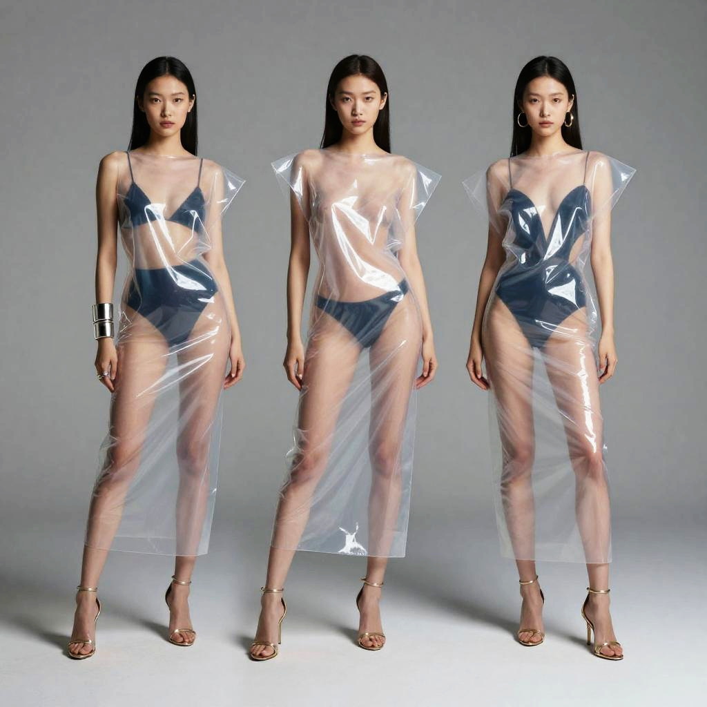 PVC Kleider in a high fashion editorial shoot, translucent plastic dresses with artistic folds and reflections, soft studio lighting highlighting the glossy surface, minimalist background, avant-garde design, modern and edgy vibe with metallic accessories