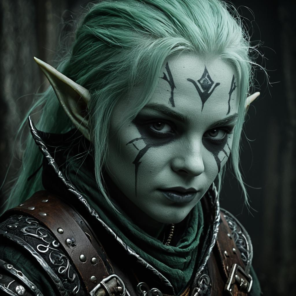 Portrait of a hauntingly detailed pale green-skinned halfling rogue wearing a dark green, intricately embroidered shadow cloak. The figure has pointed ears and intense eyes, exuding a gothic horror atmosphere with elements of isolation and madness. The character is adorned with chains and a skull pendant, evoking a dark fantasy D&D style.