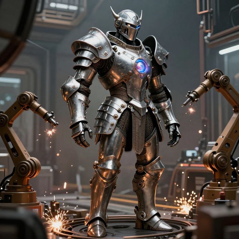 Dnd warforged art, close-up of a sentient mechanical knight with ethereal energy coursing through its joints, mystical symbols etched into metal, powerful stance against a stormy sky, sharp focus, fantasy illustration style, detailed textures