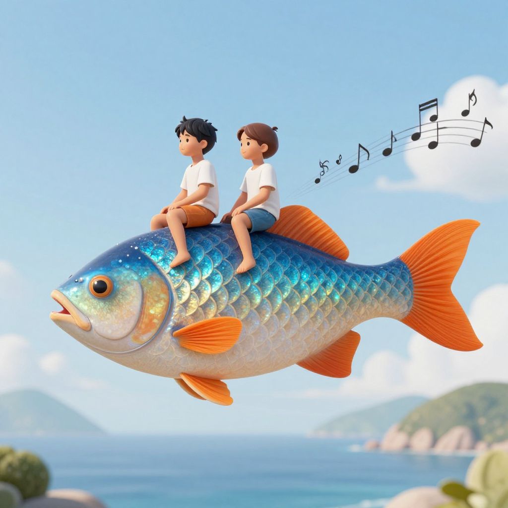 This digital illustration features two young boys with short black and brown hair, respectively, sitting back-to-back on a large, blue and orange fish with a shimmering scale texture. Both boys wear white T-shirts and orange shorts. Musical notes float in the air to the right of the fish, suggesting they are singing. The background shows a clear blue sky with a few clouds and a distant, blurry coastline with green hills and a blue ocean. The fish's fins are prominently orange, contrasting with its blue body. The overall style is whimsical and cartoon-like, with bright, vibrant colors and a playful, imaginative theme.