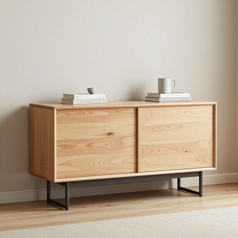 Mueble de diseño contemporáneo en una sala minimalista, con líneas limpias y materiales naturales como madera clara y acero, iluminación suave y ambiente acogedor, estilo escandinavo moderno, enfoque en funcionalidad y estética equilibrada.