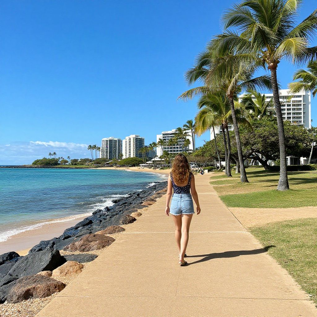 Woman strolling along the Esplanade at Kaanapali Beach in Maui, Hawaii, with turquoise waters, golden sand, and palm trees lining the scenic pathway under a clear blue sky.